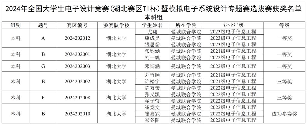 在刚刚落幕的2024年全国老员工电子设计竞赛(湖北赛区TI杯)暨模拟电子系统设计专题赛选拔赛中,永利集团3044的学子们以卓越的表现脱颖而出,两支队伍荣获一等奖,一支队伍荣获二等奖,两支队伍荣获三等奖,一支队伍成功参赛,展现了公司学子扎实的学术实力和勇于探索的创新精神。